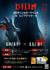 ハロウィンホラーイベント in なごアグリパークなごアグリパークで初のハロウィンホラーイベント開催!~「長く閉ざされた闇のエリア」が再び開かれる~【イベント概要】イベント主催・運営:株式会社マルユウ建設開催期間: 2025年10月17日(金)~11月3日(月)