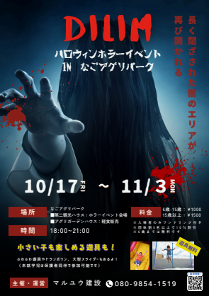 開催時間: 18:00~21:00開催場所:ホラーイベントの会場:なごアグリパーク・第二観光ハウス軽食販売: なごアグリパーク・アグリガーデンハウス【料金体系】6歳未満: 無料/6歳~15歳: 1,000円(税込)/15歳以上: 1,500円(税込)団体割引: 5名以上で10%割引特典: 入場者全員にワンドリンク付き【イベントの特徴】1. 本格的なホラー体験👻第二観光ハウスを活用、「長く閉ざされた闇のエリア」をテーマとした本格的なお化け屋敷を展開。幅広い年齢層に対応した恐怖体験を提供。2. ファミリー向け遊具も充実🛝小さなお子様連れのご家族にも配慮、ふわふわ遊具、トランポリン、大型スライダーなどの遊具が無料で利用可能。(未就学児は保護者同伴で参加可能)3. 軽食・ドリンクサービス🍹アグリガーデンハウスにて軽食販売、入場者全員にワンドリンクをサービス。ぜひお越しください~ -
